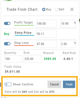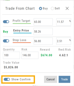 Toggling “Show Confirm” to Off, will bypass the Order Ticket window and convert the “Trade from the Charts” action to an Order Ticket itself.